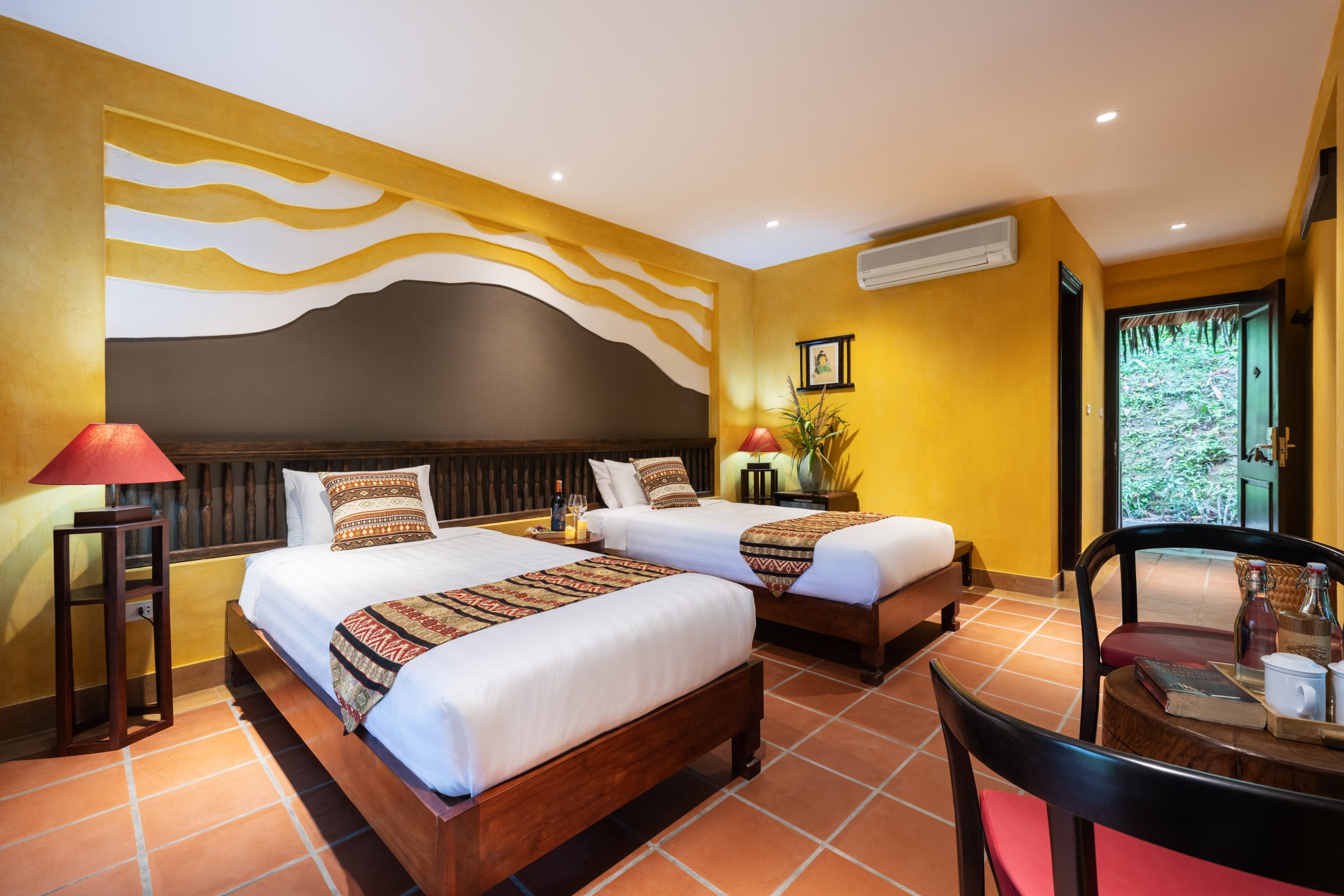 Mỗi phòng tại Panhou Retreat Hà Giang đều mang đậm nét văn hóa của người Dao. Nội thất được làm hoàn toàn bằng gỗ và trang trí nhiều cây xanh mang đến không gian nghỉ dưỡng tinh tế và thoải mái nhất cho du khách. Màu sắc được phối nhẹ nhàng, tạo điểm nhấn bằng những chi tiết nhỏ như tranh treo tường, chăn ga hay đèn chiếu sáng.